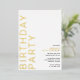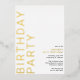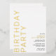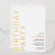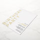 Des invitations d'anniversaire de style moderne et minimaliste, avec un design neutre pour les deux sexes. Le grand texte "BIRTHDAY PARTY" et le texte "[nom] anniversaire" seront imprimés en papier métallique réel, tandis que le texte des détails de l'événement sera imprimé en noir mat, pour une lisibilité aisée. Feuille d'or sur un arrière - plan blanc aéré.