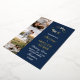 Faire-part de mariage photo en papier peint bleu, blanc et or personnalisé avec trois photos et vos initiales encadrées de petites fleurs blanches d'un côté, et une autre photo à l'arrière. Faire-part de mariage en feuille d'or informel en bleu foncé avec un monogramme floral avec fleurs blanches et verdure.