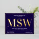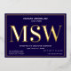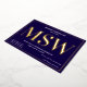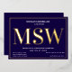 Une invitation MSW graduation party avec feuille d'or, texte blanc, et un arrière - plan bleu. Ajoutez simplement vos informations, ajoutez cette invitation à votre panier et célébrez cette réalisation majeure. Bleu Gold Degré MSW Graduation Foil Invitation Jours fériés Conception | ©Melissa Patton - Designer