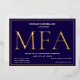 Une invitation à la fête de remise de diplômes du MFA avec feuille d'or, texte blanc, et un arrière - plan bleu. Ajoutez simplement vos informations, ajoutez cette invitation à votre panier et célébrez cette réalisation majeure. Blue Gold MFA Graduation Foil Invitation Conception de jour férié | ©Melissa Patton - Designer
