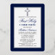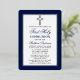Elégante Marine Bleu et Argent Première Sainte Communion Invitation avec Croix. Cadre à huile d'argent. Croix de pétrole en argent. Arêtes arrondies. Photo De Retour.