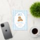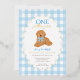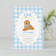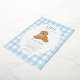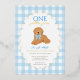 Celebrate your little one’s first birthday with this charming “One Golden Year” invitation featuring an adorable golden doodle puppy wearing a blue gingham bow. The background showcases a sweet light blue gingham checkered border with a foiled scalloped frame, perfect for a boy’s first birthday party. Fully customizable with your child’s name, party details, and RSVP information.