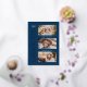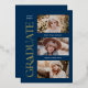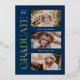 Cette faire-part de remise de diplômes élégante est aussi une invitation à une fête de remise de diplômes. L'avant présente le mot "gradué" dans la couleur de feuille de votre choix sur un arrière - plan bleu. Il dispose également d'espace pour trois photos ainsi que le nom du diplômé, l'année de classe et l'école. Le dos de la carte offre de l'espace pour une autre photo ainsi que des détails pour votre fête de remise de diplômes.