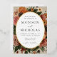Élégantes invitations de mariage d'automne avec vos détails mariages nichés dans un cadre ovale en feuille d'or entouré de fleurs d'aquarelle et de verdure dans des couleurs automnales muettes d'ivoire, d'orange, d'or moutarde, de vert olive, de rose poussiéreux et de brun. Les invitations de mariage florales d'automne s'inversent pour montrer un riche arrière - plan d'aquarelle vert olive. Conçu pour coordonner avec notre collection Boho Autumn Floral mariage.