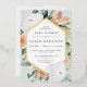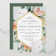 L'élégante invitation à baby shower florale neutre pour les deux sexes présente un cadre hexagonal allongé de fleurs d'aquarelle et de feuillage dans des tons de pêche inspirés du désert de saumons, de blanc, d'ivoire et de vert de sauge, et fini avec des garnitures en feuille d'or. Personnalisez avec vos détails de baby shower en lettres modernes.
