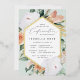 L'élégante invitation à la confirmation florale présente un cadre hexagonal allongé de fleurs d'aquarelle et de feuillage dans des teintes de pêche, blanc, ivoire et vert sauge inspirées du désert de saumons boho, et finie par un garnissage en feuille d'or. Personnalisez avec votre cérémonie de l'église et les détails de la fête de confirmation dans des lettres modernes.