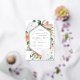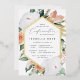 L'élégante invitation à la confirmation florale présente un cadre hexagonal allongé de fleurs d'aquarelle et de feuillage dans des teintes de pêche, blanc, ivoire et vert sauge inspirées du désert de saumons boho, et finie par un garnissage en feuille d'or. Personnalisez avec votre cérémonie de l'église et les détails de la fête de confirmation dans des lettres modernes.