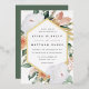 Un élégant faire-part de mariage floral présente vos détails mariages en lettrage moderne, dans un cadre hexagone géométrique allongé de fleurs pastel aquarelle et feuillage botanique dans des tons de terre inspirés du désert de pêche, vert sauge, blanc et ivoire. La garniture en feuille d'or complète la recherche d'une touche luxueuse.
