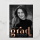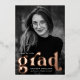 Stylish graduation announcements featuring the graduate's vertical photo with "grad" in bold rose gold foil lettering. Personalize the photo graduation announcement by adding the graduate's name, graduation year, and school. The rose gold foil graduation announcement reverses to display a black and white retro arch pattern.