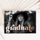 Annonces de graduation élégantes avec la photo horizontale du diplômé avec "diplômé" en gras rose feuille d'or. Personnalisez le faire-part de remise de diplômes en photo en ajoutant le nom du diplômé, l'année de remise de diplômes et l'école. Le faire-part de graduation de feuille d'or rose s'inverse pour afficher un motif d'arc rétro noir et blanc.