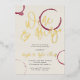 Dégustation de vin en feuille d'or et invitation à la fête de bingo en blanc cassé avec taches de verre de vin bordeaux et un script de brosse élégant. Invitation au vin et au bingo avec feuille d'or et taches de vin rouge.