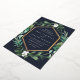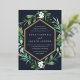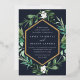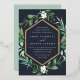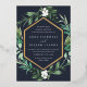 Choisissez ces invitations aux mariages botaniques aux couleurs riches pour les mariages d'hiver élégants, les noces d'automne ou d'automne, ou les mariages du soir en été. Le design chic allie éléments naturels et géométriques pour un look frais et moderne. Vos détails mariages apparaissent en lettres blanches, encadrés par une bordure en feuille d'or et entourés de feuillage vert, de feuilles luxuriants et de petites fleurs blanches sur un riche arrière - plan bleu marine. Objets correspondants disponibles dans notre collection Greenhouse.