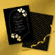 Un faire-part de mariage au design exquis, influencé par les bijoux en or, qui combine cadre et motifs en feuilles. Cet invitation contemporain présente gracieusement votre message personnalisé enfermé dans une bordure dorée qui voûte en haut et arrive à un point en bas, accompagné de branches et de feuillage disposés sur un fond de noir. Pour le rendre plus unique, les noms du couple sont affichés en or sur un arrière - plan noir dans une mise en diagonale à l’arrière.