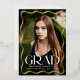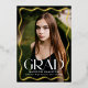 Célébrez votre diplôme d'études secondaires ou collégiales avec cet élégant faire-part de graduation, avec une photo verticale à fond de sang encadrée par une luxueuse bordure ondulée de feuille d'or. Le lettrage blanc gras "Grad" ajoute une touche moderne, tandis que le nom, l’école et l’année de classe du diplômé créent un look personnalisé. Le dos présente une photo horizontale avec espace pour un message personnalisé, ce qui en fait le moyen idéal de partager cette étape spéciale avec la famille et les amis.