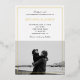Découvrez une faire-part de mariage personnalisée alliant élégance et souvenirs chéris, désormais surélevée avec des touches d'or en papier peint. La partie supérieure de cet invitation exquis, encadrée par une délicate bordure en or, présente vos détails mariages dans une combinaison étonnante d'élégants scripts pour les informations d'introduction et de réception, et une police serif intemporelle pour le texte restant, le tout mis en évidence avec de l'or en papier pour les noms du couple, ajoutant un air de sophistication et de grâce. Ci-dessous, l'invitation devient un souvenir précieux avec l'ajout de votre photo choisie, créant une touche personnelle qui captive et ravit vos invités. Cette invitation est plus qu'une faire-part, c'est un magnifique reflet du lien spécial que vous partagez, rendu inoubliable avec ses accents dorés luxueux.