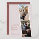 Présentant notre fascinant mariage "Capture Love" Save the Date Card, un mélange enchanteur de nostalgie du stand photo et d'esthétique contemporaine. Ce design unique résume l'essence de votre voyage ensemble, invitant les proches à marquer leur calendrier pour votre journée spéciale. L'arrière - plan dégage un air d'allure vintage, qui rappelle les bandes classiques des cabines de photos qui renferment des souvenirs chéris. Les tons de bleu doux et de terre cuite forment le fondement de cette palette de couleurs tendance, évoquant les sentiments de romantisme et d'intemporalité. Ces teintes s'entrelacent gracieusement, créant un cadre harmonieux qui accentue le point central de la carte. Au premier plan, un agencement astucieux de vos photos fiançailles préférées occupe le devant de la scène. Chaque cadre est un moment chéri figé dans le temps, invitant les invités à partager votre joyeux voyage. L'appariement des polices pour le texte est une incarnation de l'élégance moderne. Les principaux détails, tels que les noms du couple et la date du mariage, sont joliment écrits dans une police serif sophistiquée. Ceci vient compléter le texte de support, qui utilise une police de calligraphie élégante. La combinaison reflète non seulement la dualité de votre histoire d'amour, mais ajoute également une touche de raffinement au design général.