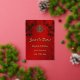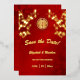 Des fleurs de cerisiers rouges et une véritable feuille d'or double symbole de bonheur sur un arrière - plan rouge chatoyant. Enregistrez le texte de date dans un script élégant. Produits mariages chinois correspondants disponibles.