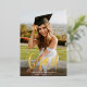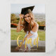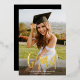 Ce faire-part de graduation comporte une photo pleine image et un script moderne "Grad" en feuille d'or surélevée sur le devant. Sur le dos il y a une autre photo et un texte d'invitation pour une fête de remise de diplômes. La photo et le texte sur le dos peuvent également être enlevés si désiré.