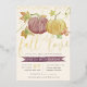 Tombez amoureux de ces élégantes invitations à la douche nuptiale d'automne rustique. Le design comprend un citrouille d'aquarelle orange et rose orné de feuilles d'automne, et un script de calligraphie "Fall in love" en feuilles d'or chic. Personnalisez avec votre douche nuptiale et les détails du registre en dessous.