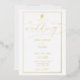 Une toute petite branche de lys de fleurs de la vallée avec un arc en or autour, de style boutonnière, dessinée à la main dans un crayon en graphite noir et recouverte d'une feuille d'or, décore cet élégant, moderne, simple et sophistiqué modèle d'invitation au mariage de printemps qui dispose d'un cadre en faux relief (pas de vrai gaufrage ! l'effet est réalisé numériquement), calligraphie moderne avec de grands fleuris et feuille d'or. Ce faire-part de mariage de dessin d'art serait un très bon choix pour les couples qui aiment le noir, le blanc et l'or, les dessins d'art et les modèles minimalistes modernes avec une touche de formel et traditionnel mis à jour.