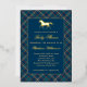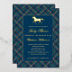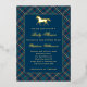 Classic Preppy Plaid Blue Equestrian Baby Shower Invitation with Real Gold Foil Accents - A preppy, classic and luxury baby shower invitation with equestrian and plaid elements in navy, hunter green with gold tone and burgundy red accents. A running horse silhouette adorns the top and the tartan pattern adds a timeless touch. Perfect for an Old Money themed baby shower with a classic, vintage and luxurious feel. If you like grandpa core, vintage style this is a great baby shower invite. Available in print and as a digital download. Customize this editable baby shower invitation template with your own event details.