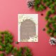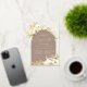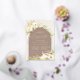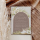 Les invitations de confirmation Tropical chic dans une palette de couleurs neutres séduisantes comprennent une arche en feuille d'or rose portant votre cérémonie d'église et les détails de la fête ou de la fête, accentuée avec des frondes de palmier vert pâle, le feuillage de l'île de la plage, orchidées blanches, botaniques séchés et gazon de la pampa.
