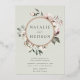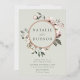 Élégantes invitations de mariage florales hivernales avec vos noms encerclés par une feuille d'or rose avec fleurs d'aquarelle et feuillage sur un arrière - plan vert sauge. Les fleurs d'hiver sont recouvertes d'une palette de couleurs de rose, rose clair, ivoire et jaune doré doux, avec des feuilles d'eucalyptus et des feuillages d'hiver dans des tons vert sauge et vert forêt riche.