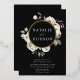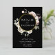 Élégantes invitations de mariage florales hivernales avec vos noms encerclés par une couronne de feuille d'or avec fleurs d'aquarelle et feuillage sur un arrière - plan noir. Les fleurs d'hiver sont recouvertes d'une palette de couleurs de rose, rose clair, ivoire et jaune doré doux, avec des feuilles d'eucalyptus et des feuillages d'hiver dans des tons vert sauge et vert forêt riche.