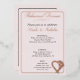 Il s'agit d'une invitation à dîner de répétition de 5' x 7'', présentée en rose pâle, avec des accents de feuille d'or rose. Il s'agit d'une véritable garniture en feuille, disponible en or, argent et or rose. Les accents de papier comprennent la bannière de la répétition, le nom de la mariée et du marié, un coeur fantaisiste, un design rose et un contour de papier sur le devant. l'inverse inclut le nom de la mariée et du marié et l'illustration du coeur.
