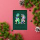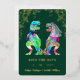 Introducing the perfect way to add a playful touch to your big day. Dinosaur Themed Wedding T-Rex Bride and Groom gold foil Save the Date Invitation. Featuring vibrant watercolor illustrations of a charming T-Rex bride and groom, this save the date wedding invitation is sure to bring smiles to your guests' faces. Gold foil script and modern typography and eucalyptus leaf foliage gold foil detailing, combines fun and elegance in one delightful design on a striking dark emerald green background.