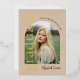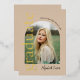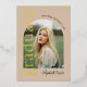 Cette invitation contemporaine et élégante à la remise des diplômes est idéale pour tout diplômé. Il présente la typographie dorée en feuille d'or chatoyante et comprend une photo du diplômé sur le côté avant, dans cadre d'arche moderne et tendance.