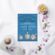 Ces invitations à dîner Hanoukka sont faites spécial avec des accents de l'impression de feuille d'or réelle et votre texte personnalisé. Conçu sur un arrière - plan d'un bleu foncé moyen riche, le thème principal est trois dreidels rustiques sur le fond dans un faux graphique en bois de chêne au-dessus d'une rangée de vrais pois de feuille. Le thème des points continue sur ces invitations de parti Hanoukka personnalisés avec une double rangée en haut du design et une seule rangée en bas du centre. COCKTAILS DREIDELS & DINNER dans une simple police de caractères est également imprimé en papier or réel et peut être édité par vous si vous le souhaitez. Le reste du texte sur ces invitations à Chanukah est en blanc et vous donne trois zones à personnaliser avec les détails de votre parti. Chaque carte d'invitation revient à un bleu ciel clair avec des pois bleu profond.