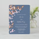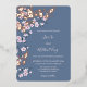 Cette faire-part de mariage florale classique présente des branches de fleurs de cerisier en feuille d'or rose poussiéreuse et rose sur un arrière - plan bleu poussiéreux. Noms de mariée et de mariée dans un élégant script manuscrit. Produits assortis avec seulement des fleurs de cerisiers roses poussiéreuses disponibles.