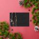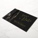 Cette élégante carte moderne de sauvegarde de date présente une bordure d'agate noire à l'aquarelle rehaussée de fausses paillettes dorées. Le texte personnalisable combine une écriture manuscrite en feuille d'or véritable, des polices copperplate et italiques sur un fond noir décalé. Le verso présente un dessin assorti d'agate noir et or.