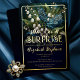 Elégant style baroque foncé et moody bleu et blanc floral "SURPRISE" design de fête d'anniversaire. Le lys blanc des fleurs de la vallée et les fleurs d'aubépine bleu foncé avec la végétation luxuriante et verdoyante, sur un arrière - plan turquoise à bleu foncé. Ajoutez à cela le luxe d'une véritable feuille d'or, et vous avez une fête d'anniversaire qui est à la fois sophistiquée et intemporellement élégante, mais aussi radicalement moderne.