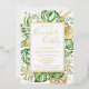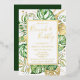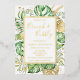 Cette élégante invitation à la douche tropicale nuptiale est parfaite pour le brunch au champagne nuptiale. Il est doté de palmiers verts et dorés, de philodendron et de feuilles de fougères derrière un cadre élégant en feuille d'or. Le texte de feuille d'or est entièrement personnalisable. Les plaques en feuille d'or accentuent ce design botanique exotique et apportent un peu de fantaisie sophistiquée à l'invitation. Cet invitation d'oasis insulaire est parfait pour tout brunch nuptial élégant extérieur, plage ou tropical.