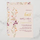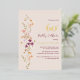 Cette invitation à la fête d'anniversaire, simple et élégante, présente de beaux fleurs sauvages sur un arrière - plan de champagne, et une belle gamme de fleurs sauvages et de papillons colorés à l'arrière. Le design est d'inspiration bohème, avec un esprit fantaisiste et romantique.