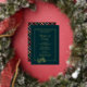 Un luxueux mélange de vert turquoise profond et de véritable feuille d'or donne un ton d'élégance intemporelle, magnifiquement contrasté par une plaid riche et classique dans les tons bordeaux, vert turquoise foncé, et marine profonde, subtilement accentuée de fils d'or faux. Un simple motif creux encadré dans une bordure rectangulaire raffinée ajoute une touche traditionnelle au devant, créant une invitation à Noël frappante mais sobre, prête à briller avec vos détails personnels. Parfait pour vos réunions de vacances, des fêtes personnelles aux fêtes d'entreprise.