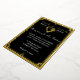 Il s'agit d'un faire-part de mariage de 5' x 7'', montré en noir élégant avec des accents de feuille d'or. L'invitation a un coeur de papier peint avec une saveur d'ensemble art déco. Il s'agit d'une véritable feuille italienne, disponible en or, argent et or rose. Les accents de feuille comprennent le nom de la mariée et du marié, un coeur fantaisiste et une ligne horizontale, un motif de fleur de tulipe, et un contour de feuille à l'avant. Le revers comprend un motif "Notre journée spéciale", avec des détails sur le mariage.