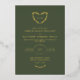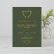 Faire-part de mariage vert olive foncé avec fontes en feuille d'or et verdure. Faire-part de mariage en feuille d'or monogramme avec vos initiales dans une couronne de verdure en forme de coeur. Faire-part de mariage vert olive et or avec une belle couronne de verdure dessinée à la main en forme de coeur.