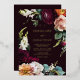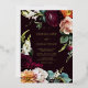 Cet élégant faire-part de mariage d'automne présente un véritable script de calligraphie de feuille d'or avec une bordure florale de roses rose bordeaux, orange, blanches et rousses à l'eucalyptus. Le dos de la carte est bordeaux foncé. Félicitations pour votre prochain mariage ! Conçu par Susan Coffey.