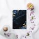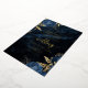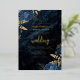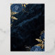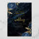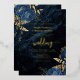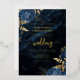 Cette élégante invitation à un mariage présente des bouquets de fleurs bleues agrémentés d'une végétation en faux feuille d'or dans deux coins, sur une image arrière - plan d'agate d'aquarelle bleu marine. Le texte personnalisable combine des polices de papier doré, italique et d'écriture manuscrite. L'envers est assorti d'un bleu marine et d'un design floral or et agate.