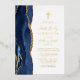 Le bord gauche de cette élégante invitation à la première communion moderne comporte une bordure en aquarelle bleu marine ornée d'une parties scintillant en faux or. Une petite croix apparaît au-dessus du texte personnalisable, qui combine écriture manuscrite, copperplate et italique en véritable feuille d'or sur un arrière - plan blanc. L'envers est assorti d'un design d'agate bleu marine et or. Idéal pour la première communion d'un garçon.