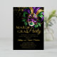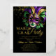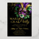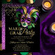 Set against a dramatic black background, the ornate mask design evokes classic New Orleans elegance, while the coordinating purple glitter-style back adds a bold, festive finish. Perfect for Mardi Gras parties, masquerade balls, Carnival celebrations, or upscale evening events, this invitation is fully customizable with your event details.