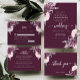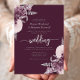 This elegant wedding invitation features mauve floral bouquets set off with silver faux foil greenery in two corners, on a deep mauve background. The customizable text combines real silver foil serif, italic and handwriting fonts. The reverse side features a matching mauve and silver floral design.