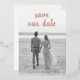 Photo enregistrer la carte de date avec votre image verticale de fond de saignement et une superposition de texte avec "enregistrer notre date" dans une épaisse écriture manuscrite avec vos noms et votre date en feuille d'or rose réel. L'arrière a tous les détails de votre mariage en noir sur un arrière - plan blanc. Un design simple et moderne qui fait de votre photo la principale caractéristique.