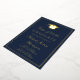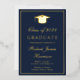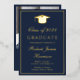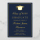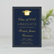 Élégant faire-part officiel de diplôme de l'université bleue et invitation de la fête avec de la feuille d'or réelle, un casquette diplômé, le nom et l'année de classe du diplômé dans un script de calligraphie classique, et leur école, majeure et les honneurs. Au verso, ajoutez une photo et personnalisez les détails de votre fête en lettres dorées.
