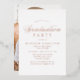 Invitations élégants de la fête de remise de diplômes présentant les détails de votre fête de remise de diplômes avec écriture rose en feuille d'or. Les simples invitations de la fête de remise de diplômes s'inversent pour montrer la photo de fond de sang du diplômé. L'invitation de la fête de remise de diplômes en feuille d'or rose est parfait pour les diplômés du secondaire et du collège!