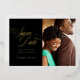 Donnez le ton à votre prochain mariage avec cet élégant enregistrer l'annonce de la date avec la police de script de calligraphie de feuille d'or sur un arrière - plan noir. Personnalisez avec vos détails et votre photo sur la moitié droite de la carte. Remplacez le code QR au verso pour pointer vos invités vers votre site Web mariage.
