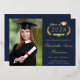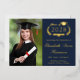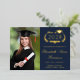 Modern dark blue college graduation party invitation featuring real gold foil, "Class of" in an illustration of laurel wreath incorporating a grad cap topper and diploma, a photo of the graduate and their name in an elegant script. Add their school, major, honors or future plans. On the back side, add the grad party details in simple light gold typography.